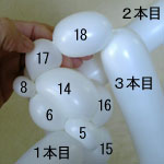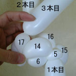 7.5cmが6cmに縮むぐらいのにぎりひねりでバブル(14、15)を作って、後頭部のしぼりひねり(5)に引っ掛けてください。