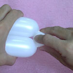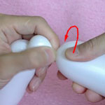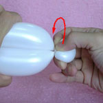 結び目を親指と人差し指でつまんで、中指で長い方のバルーンを押さえてください。